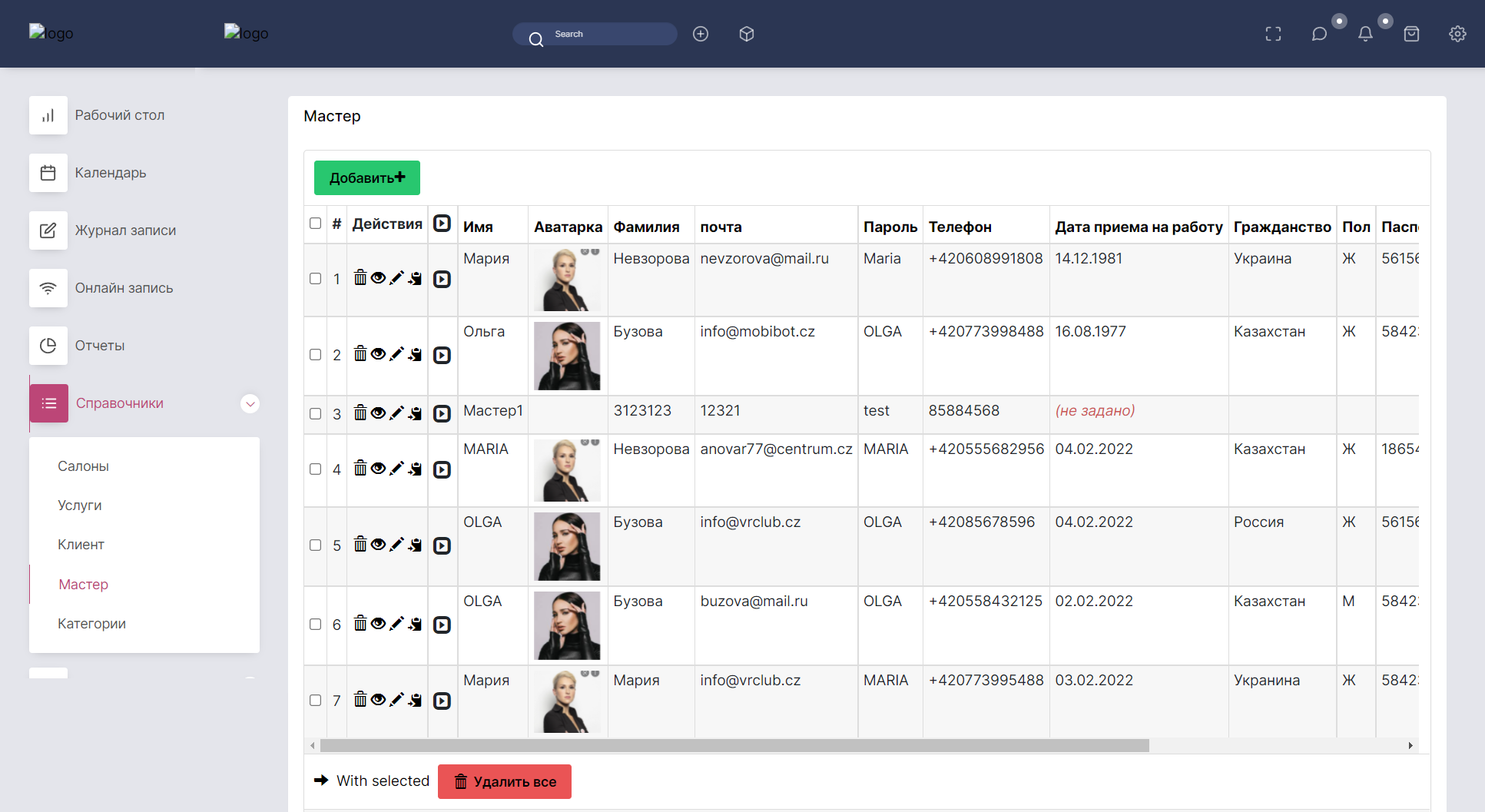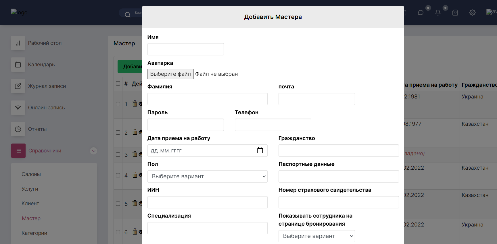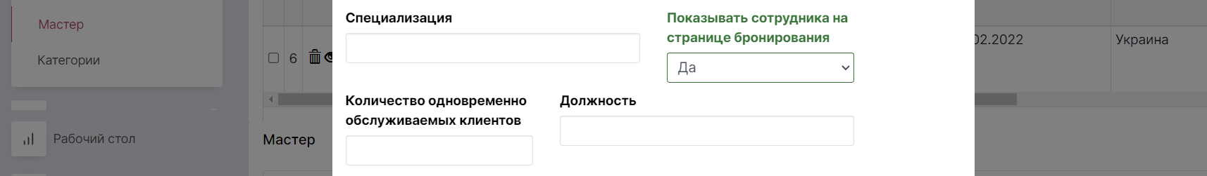 В карточке нового сотрудника внесите - Имя, Фамилию, Электронную почту (на которую будут приходить все уведомления и напоминания), номер телефона, пароль для входа в систему, специализацию (например мастер маникюра, косметолог), а так же “должность” сотрудника, причем специализация и должность должны совпадать.