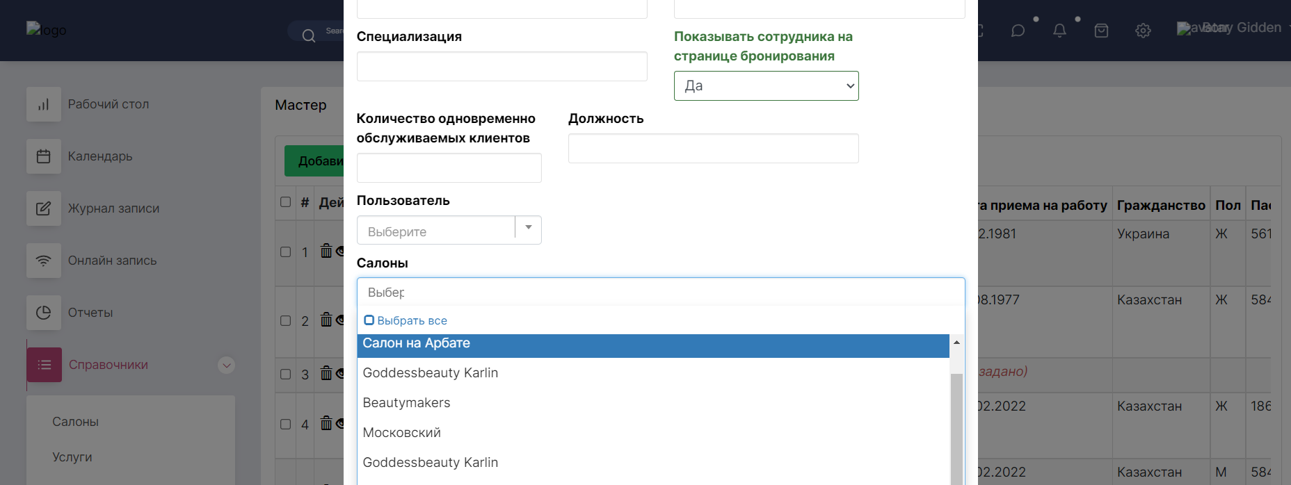 Следующий шаг заполнения - это выбор салона, либо салонов в котором будет работать мастер.