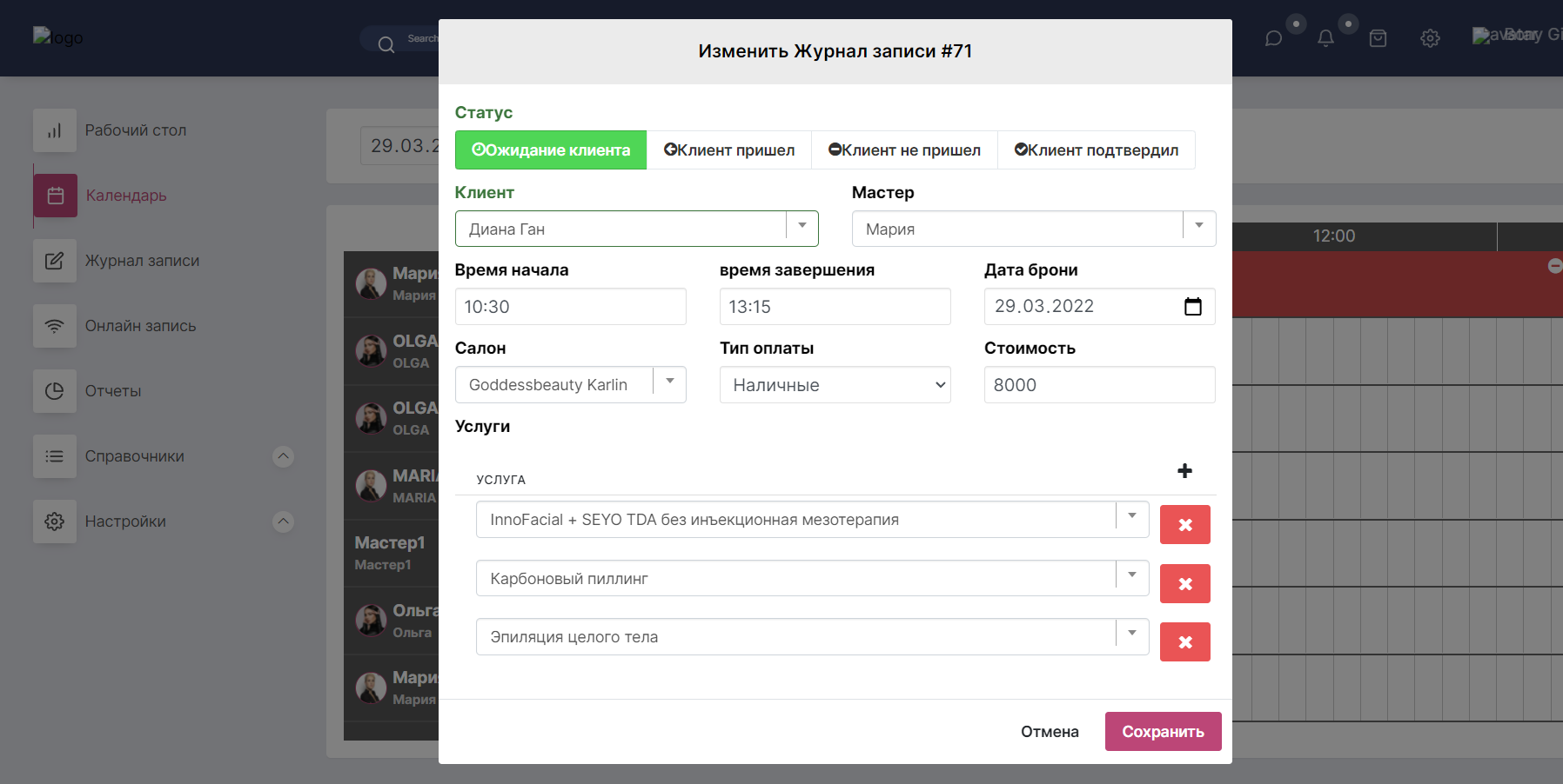 Клиент подтвердил (отображается оранжевым цветом и соответствующей иконкой как в карточке записи, так и в календаре записи).