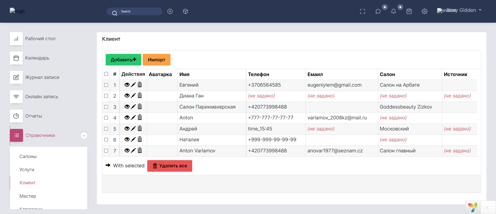В данной категории отображаются данные клиентов, зарегистрированных в системе. Данные о клиенте сохраняются автоматически при заполнении всех шагов в виджете онлайн-записи, боте онлайн-записи или записи администратора.